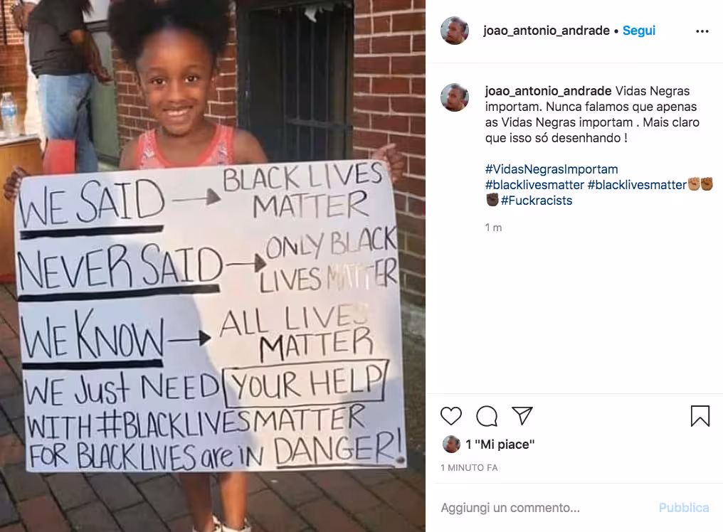 Su Instagram, questo scatto di Joao Antonio Andrade dove una bambina tiene un cartellone pronto per una manifestazione di protesta.