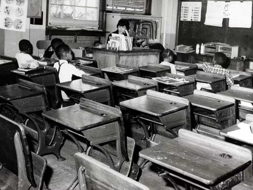 Spesso, nelle scuole di bianchi che venivano integrate con studenti neri si verificavano degli scioperi degli alunni e degli insegnanti. In questa foto, molti banchi sono vuoti e i bambini non andavano in classe a causa della presenza delle persone nere.