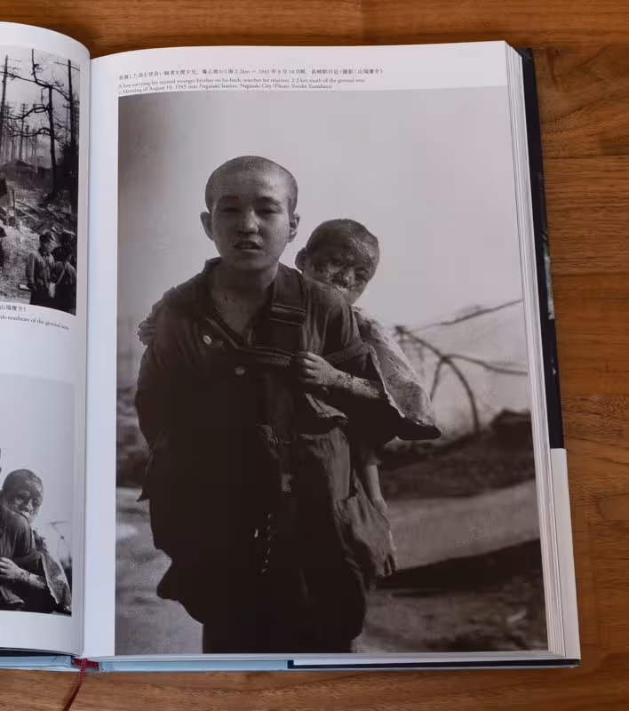 ⬆︎ _Un ragazzo porta sulle spalle suo fratello ferito il 10 agosto 1945. Foto Yosuke Yamahata_