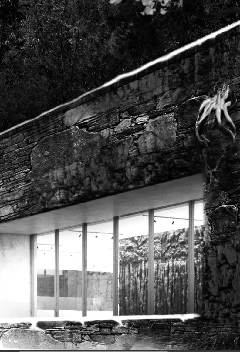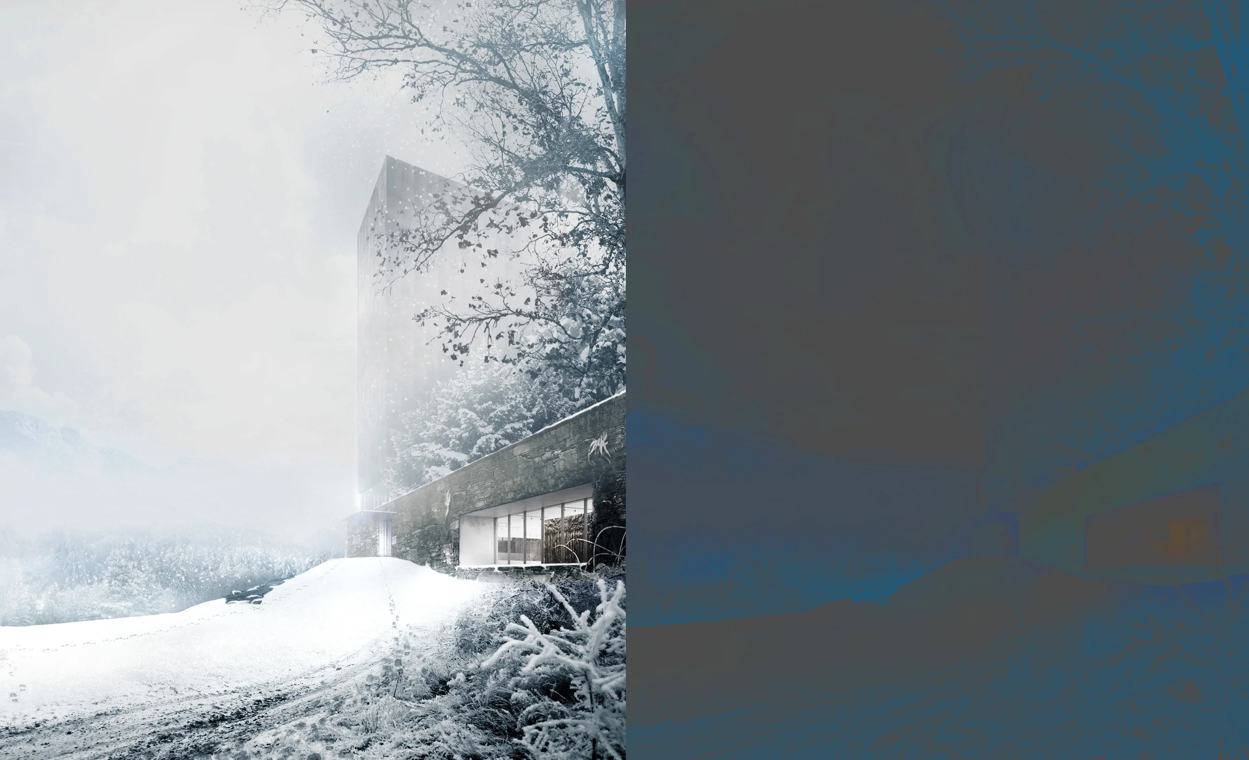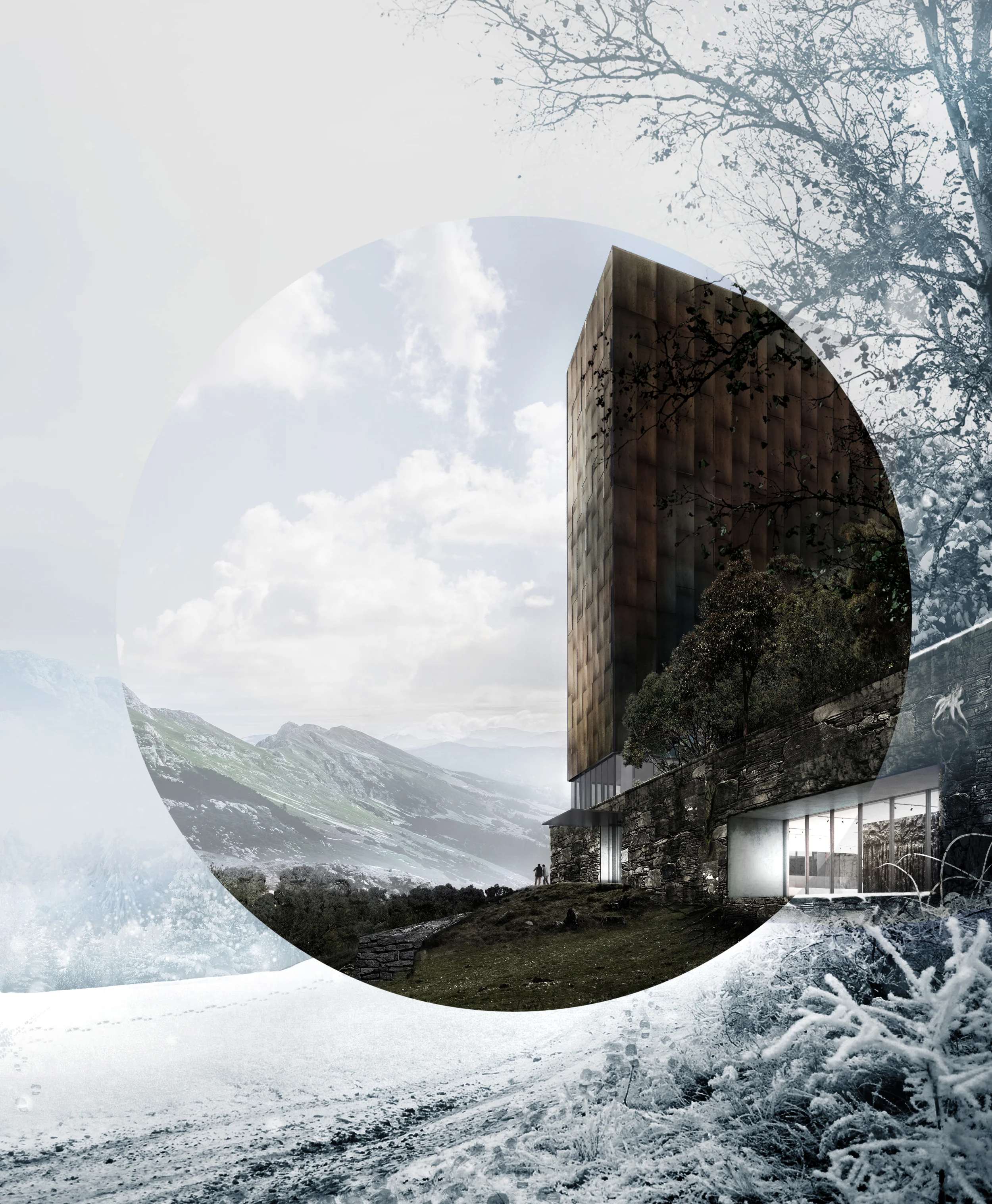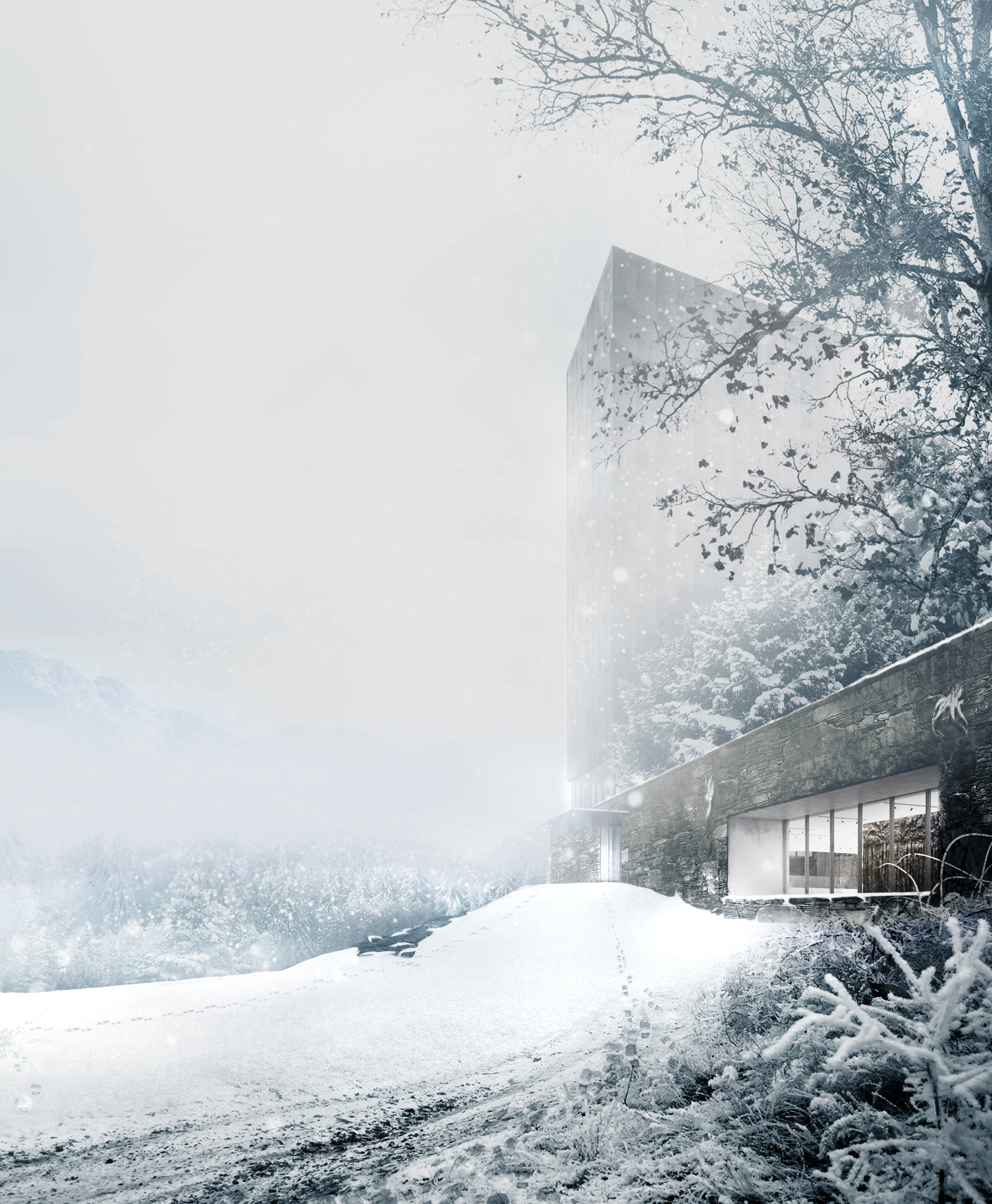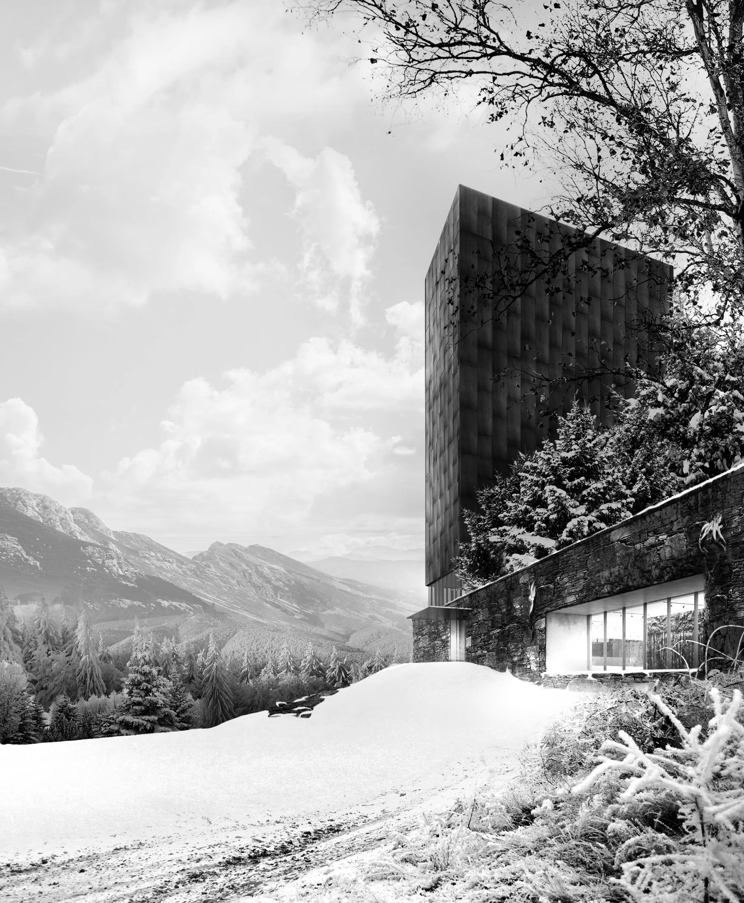 The project consists in a slender copper-cladded tower emerging from a stone podium. The site is quite wooded, and offers amazing scenic views on the surrounding landscape.