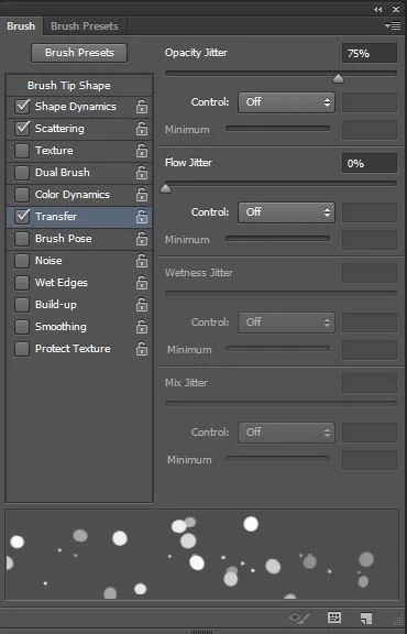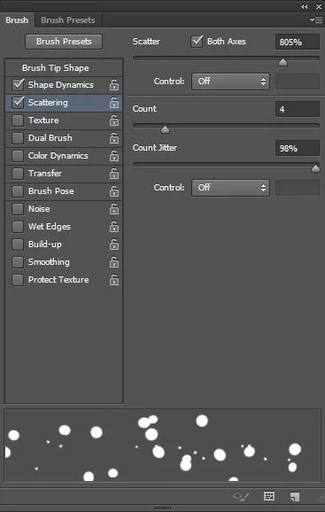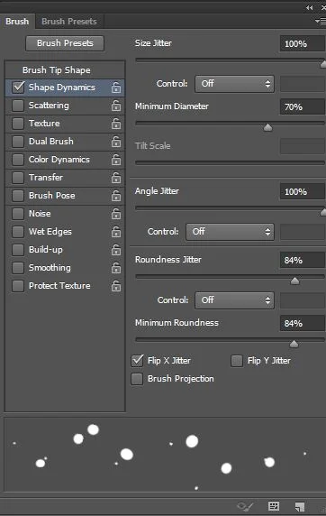 - **Angle jitter** will create randomness in the angle at which the brush is used. Pretty handy as well to create chaos in our falling snow. You can set it to a 100%