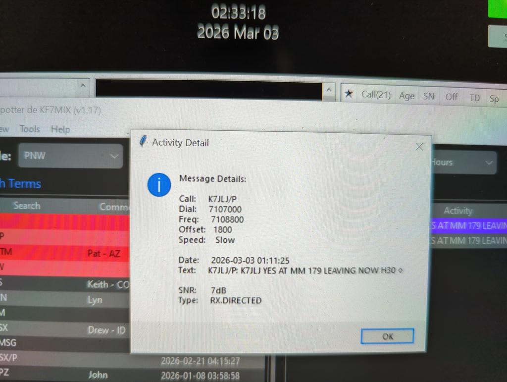 It was about an hour before sunset, too soon to be trying 40M, but I was able to get the message through, even though I got no ACK from my base station running "normal" speed @ 20W compared to my "slow" speed at 3.5W.