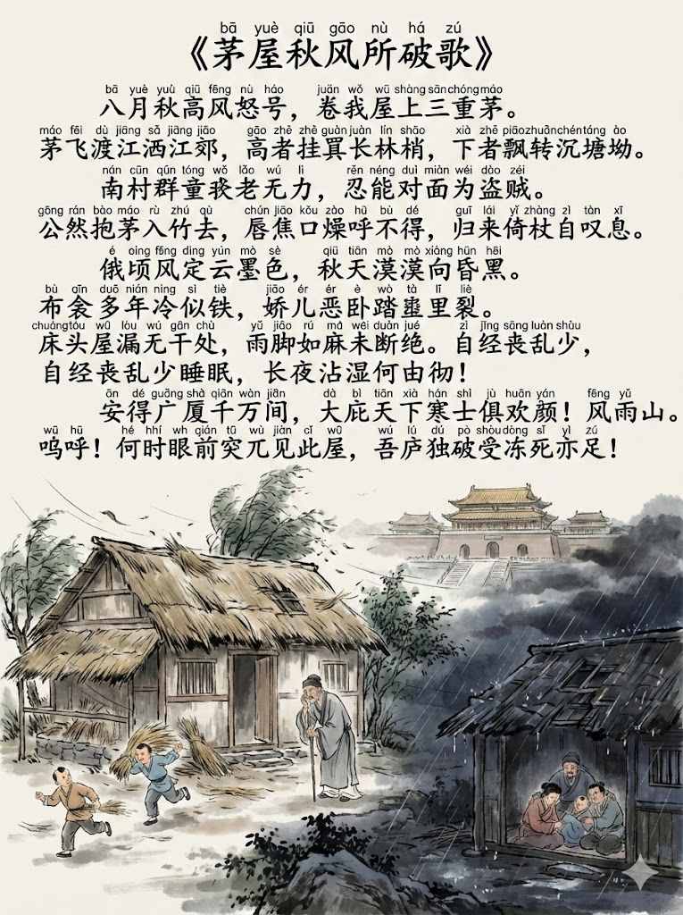 “八月秋高风怒号,卷我屋上三重茅。茅飞渡江洒江郊,高者挂罥长林梢,下者飘转沉塘坳。